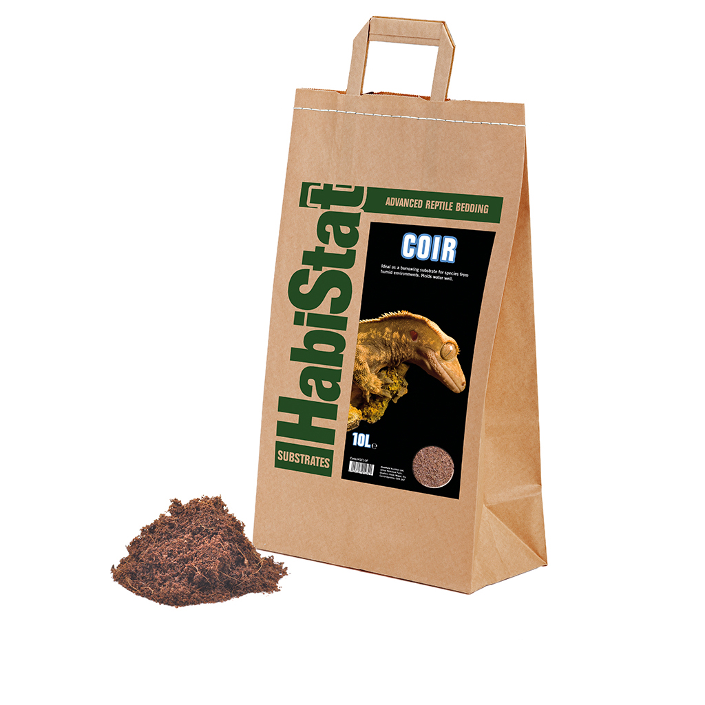 =”HabiStat Coir Substrate 10L. 100% natural and organic, HabiStat Coir Substrate is a burrowing substrate suitable for all species of reptiles, amphibians, and invertebrates from humid environments. Coir is derived from coconut husk harvested from sustainab”&”le resources, this product is soft and non-abrasive to aid burrowing, releases water slowly to keep humidity high and contains Lignin to allow use when wet without rotting. Our range of HabiStat substrates are all now packed in 100% recyclable and biodegr”&”adable paper bags. Available in 5L and 10L Bags. Directions for Use: Spread substrate evenly across vivarium base ensuring a depth of 2″” (5cm). Do not overfill if using underfloor heating. Spot clean as required and replace regularly.